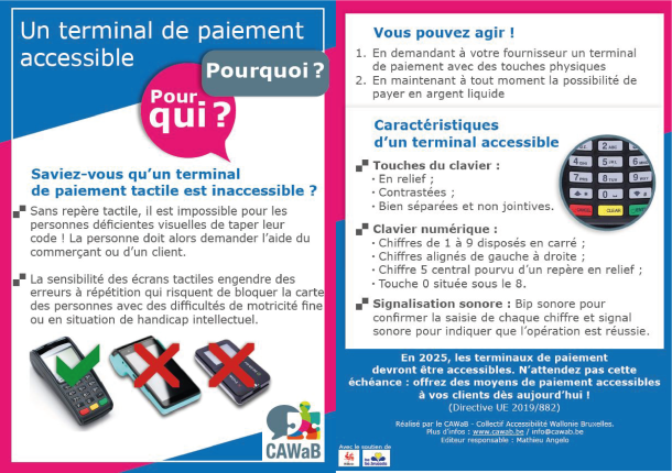 Suite à de nombreux signalements, le Collectif a réalisé une fiche de sensibilisation à destination des commerçants, afin qu’ils se procurent un modèle de terminal de paiement accessible auprès de leur fournisseur (PDF 351ko) . Le CAWaB vous invite à imprimer et à distribuer cette fiche dans tous les lieux publics où vous constatez que le terminal de paiement n’est pas accessible.