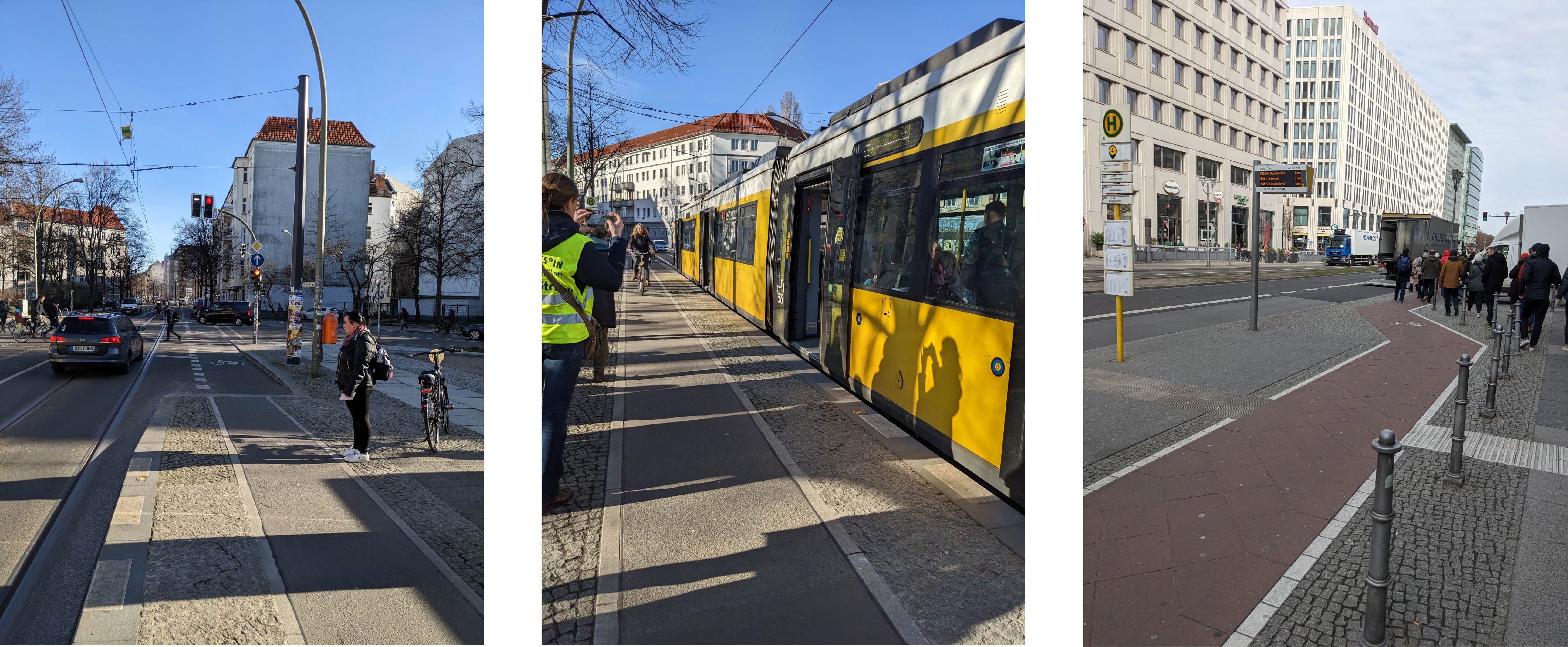 De manière générale et à la différence de Bruxelles, l’agglomération de Berlin dispose de davantage d’espace en voirie de façade à façade. L’infrastructure du tram berlinois ne permet pas aux PMR un accès de plain-pied. De plus, rares sont les arrêts disposant de lignes guides pour les personnes déficientes visuelles.