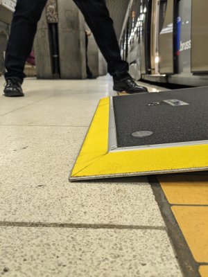 En attendant la mise en accessibilité progressive des quais et le placement des fusibles sur tout le réseau de la STIB, cette rampe légère permet déjà aux personnes en fauteuil roulant d’embarquer plus facilement, avec aide.