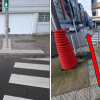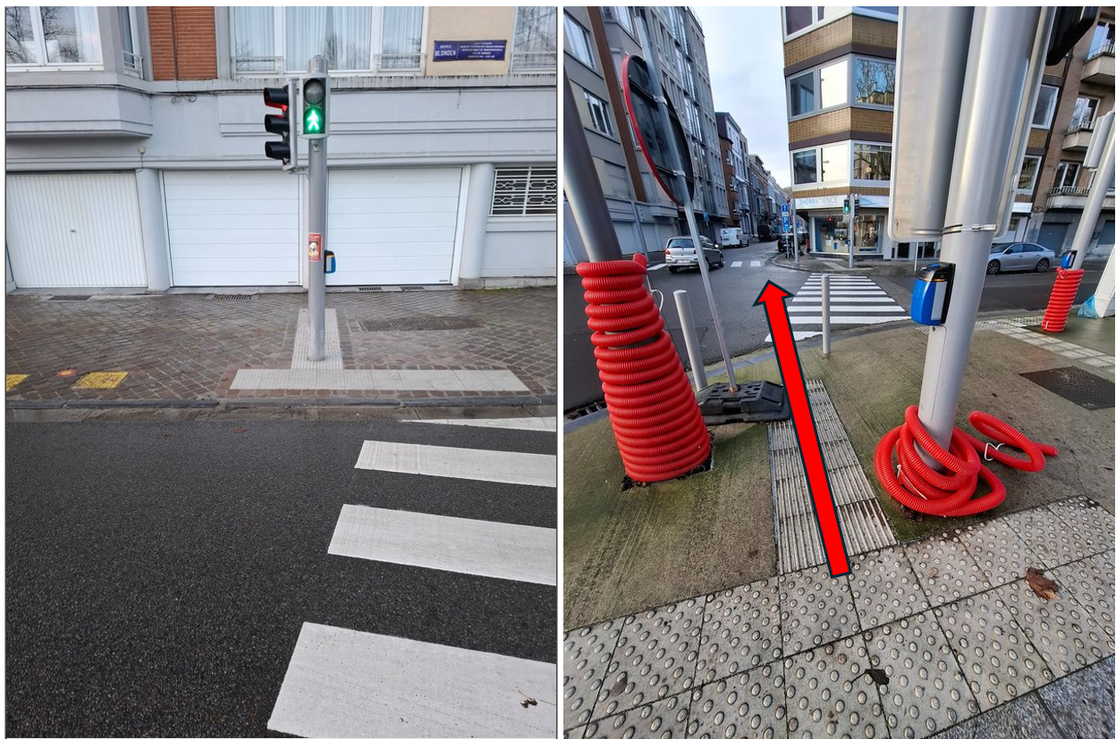 A d’autres endroits sur le tracé, les éléments podotactiles ont été installés, mais les travaux ont été mal exécutés et le guidage renvoie les usagers déficients visuels soit sur des poteaux, soit en plein milieu du carrefour.
