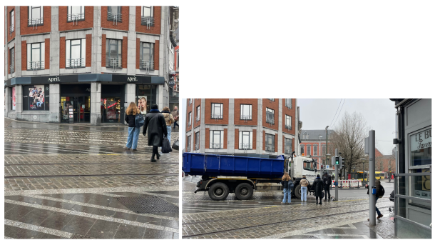 C’est donc Place Saint-Lambert que nous avons pris le temps d’exposer les préoccupations de nos membres, à savoir une absence de continuité et de lisibilité des cheminements piétons. L’absence de lignes guides (qu’elles soient artificielles ou naturelles) pose des difficultés au niveau de la circulation dans l’espace public, mais également pour rejoindre les arrêts de transports publics (lors des correspondances notamment).