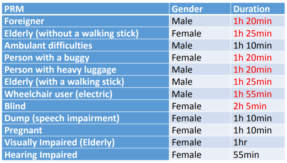 Deuxièmement, cette étude a montré que pour un trajet sélectionné, parcouru environ en 50 minutes pour les personnes valides, les temps de parcours pour les voyageurs à mobilité réduite ont été beaucoup plus longs.