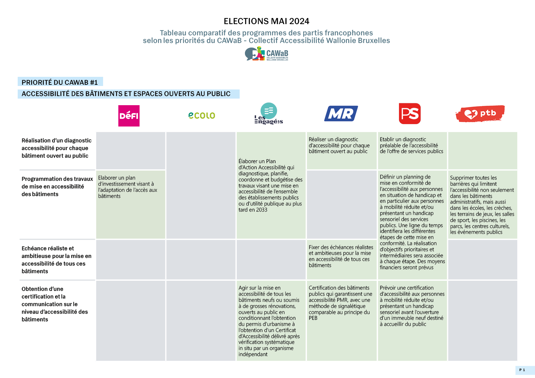 Le Collectif Accessibilité Wallonie Bruxelles (CAWaB) a analysé les programmes des six principaux partis francophones par rapport à ses priorités. Malgré le consensus politique apparent, l’analyse des propositions des partis démontre des niveaux de connaissance et d’engagement variés.