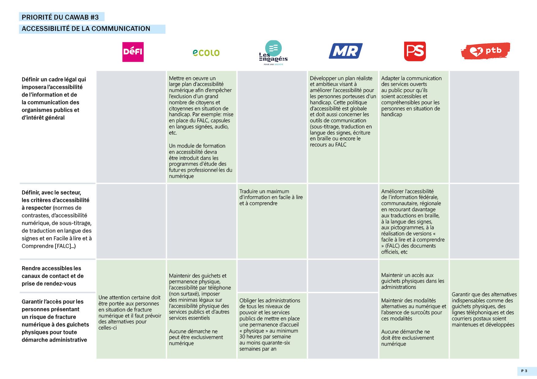 Enfin du point de vue de la communication, aucun parti ne prévoit l’obligation pour toute information publique d’être accessible à chacun et chacune mais tous les partis sauf Défi et le PTB prévoient l’usage de modes de communication adaptés en vue d’une plus grande inclusion. L’ensemble des partis hormis le MR recommande le maintien de guichets physiques pour celles et ceux en ayant besoin.