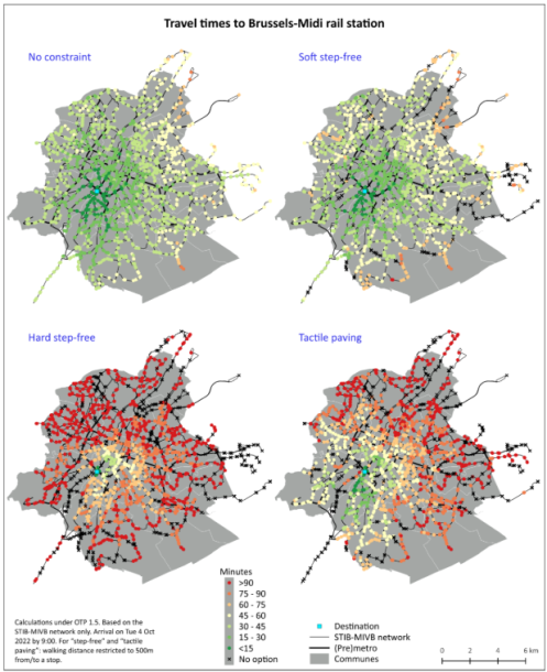 Le deuxième article sur l’accessibilité des trajets au sein du réseau de la STIB à Bruxelles, issu du projet de recherche « JUSTICE »*, a été publié par Brussels Studies. Ce travail analyse les écarts en temps de parcours depuis l’ensemble des arrêts du réseau vers 20 destinations, en fonction des contraintes de mobilité des usagers (besoin d’un accès de plain-pied, de guidage podotactile, etc.).